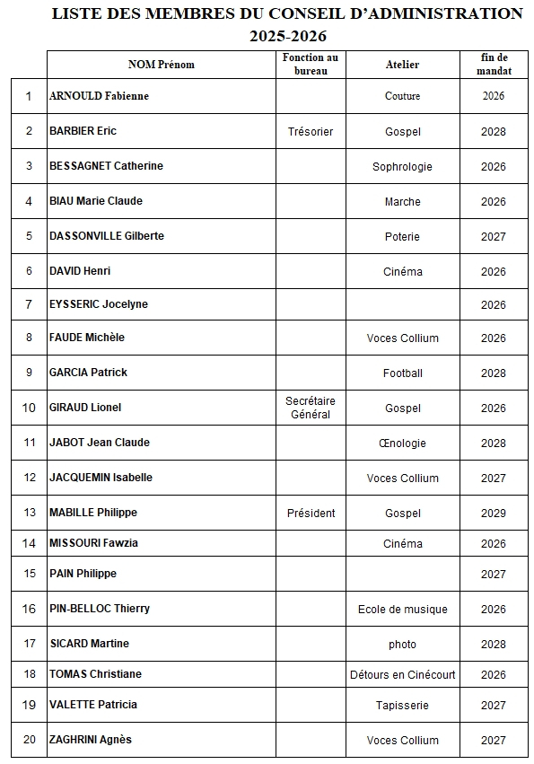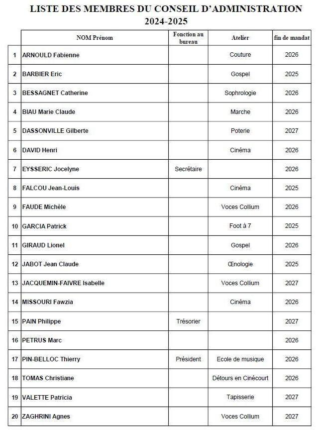 Conformément aux statuts de l'association, le Conseil d'Administration comporte obligatoirement de 10 à 20 membres, chacun doit impérativement être adhérent de l'association (ou représentant légal d'un adhérent mineur). Il est souhaitable que chaque section soit représentée au sein du Conseil d'Administration. Les administrateurs sont élus pour un mandat de 3 ans. A l'issue de leur mandat, ils peuvent se représenter sans limitation du nombre de mandats